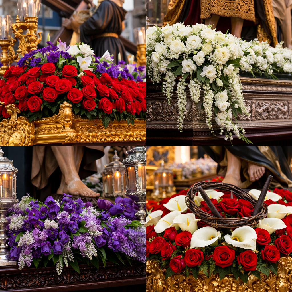 Los pasos van cargados de adornos florales cuidadosamente seleccionados , tanto en color como en el tipo de flor, ayudando a resaltar las imágenes que acompañan, y manteniendo una tradición propia que elogia tanto la primavera como el arte procesional.