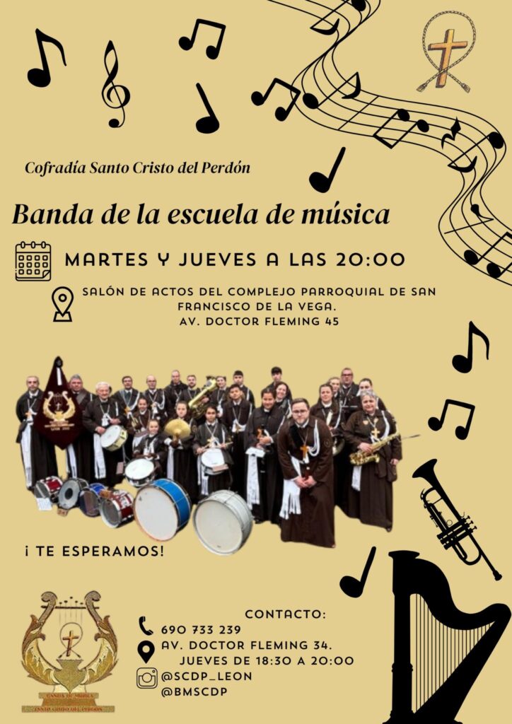 Si estás interesado en formar parte de la Banda, aún estás a tiempo. Puedes pasar a conocerlos en su local de ensayo, los martes y jueves a las 20:00 h en el Salón de Actos del Complejo Parroquial de San Francisco de la Vega (Av. Doctor Fleming, 49) o informarte en la Casa de Hermandad (Av. Doctor Fleming, 34), los jueves de 18:30 h a 20:00 h o a través del tlfno. 690 733 239.