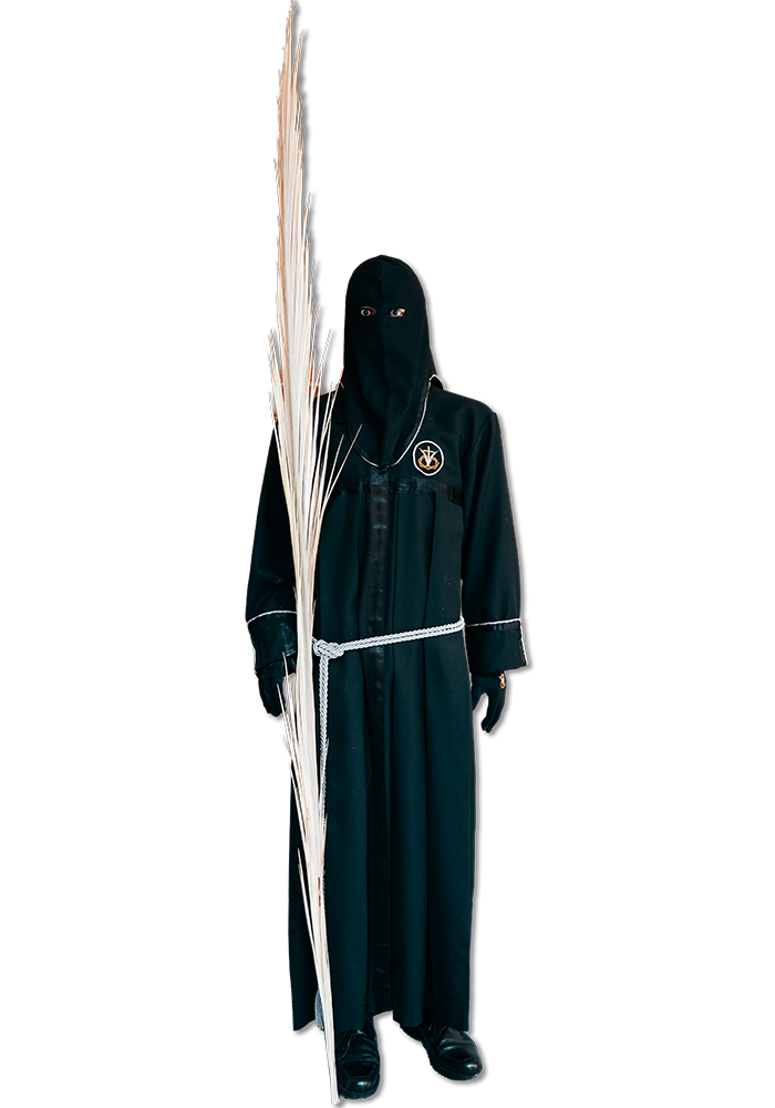 Túnica negra sencilla, con el emblema de la cofradía situado en el pecho, al lado del corazón. El hábito incluye capillo negro, así como bocamangas y cíngulo plateados, ambos ribeteados con cordón plateado.
