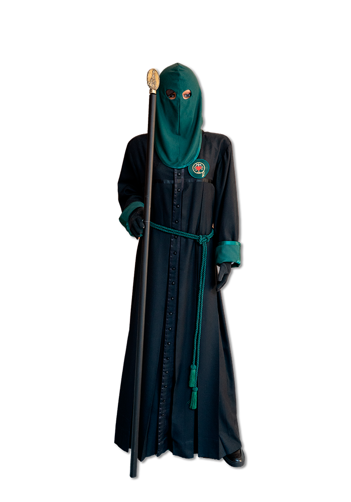 Túnica negra de tablón sencillo, capillo, bocamangas y cíngulo verde, camisa blanca, pantalón, guantes, calcetín y zapato negro.