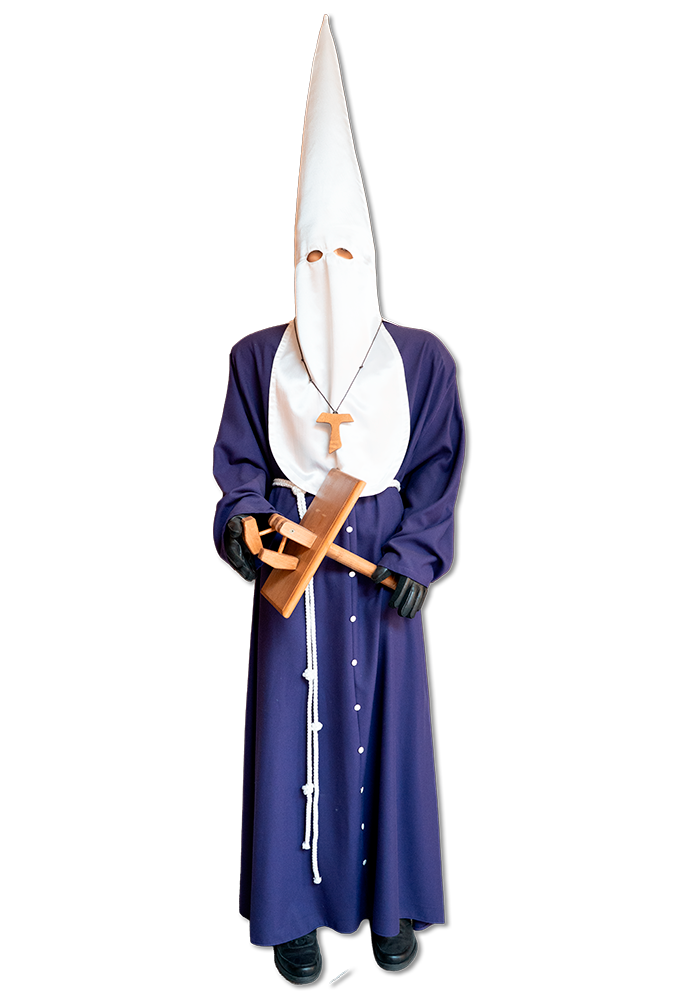 El capirote es blanco (luto) de raso, y el pectoral se ciñe superponiendo la Tau. En las procesiones, la vestimenta se completa con guantes, zapatos, calcetines, corbata y pantalón negros, y camisa blanca.