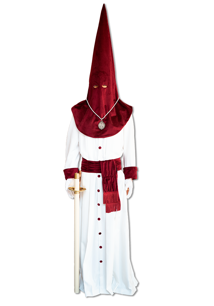 Los miembros de la Junta Directiva visten además capa de lana blanca con vueltas de terciopelo color rojo sangre.
