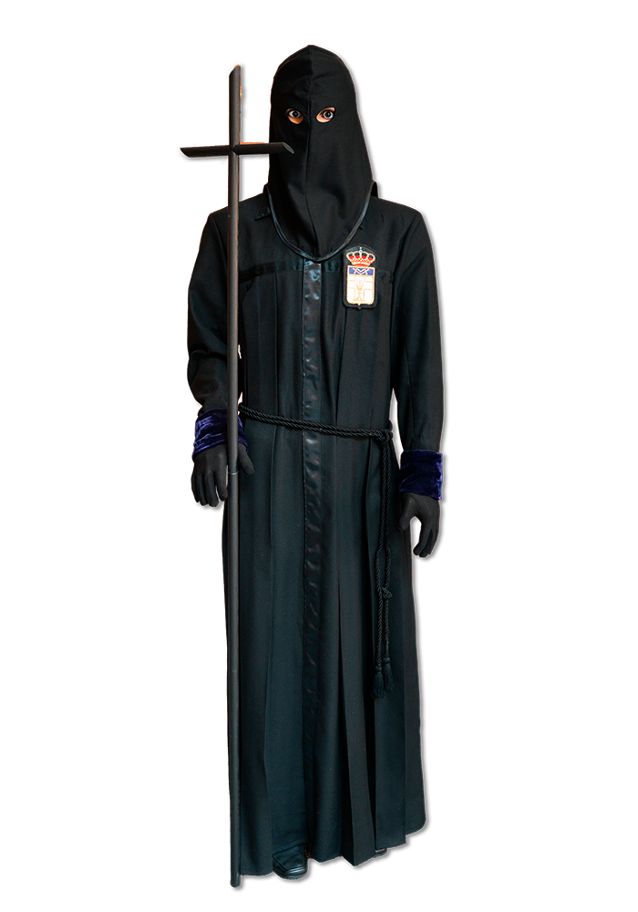 El hábito está compuesto por túnica negra lisa de tablón sencillo, con bocamangas de terciopelo morado. Se completa con camisa blanca, guantes negros, pantalón negro, calcetines negros y zapatos negros.
