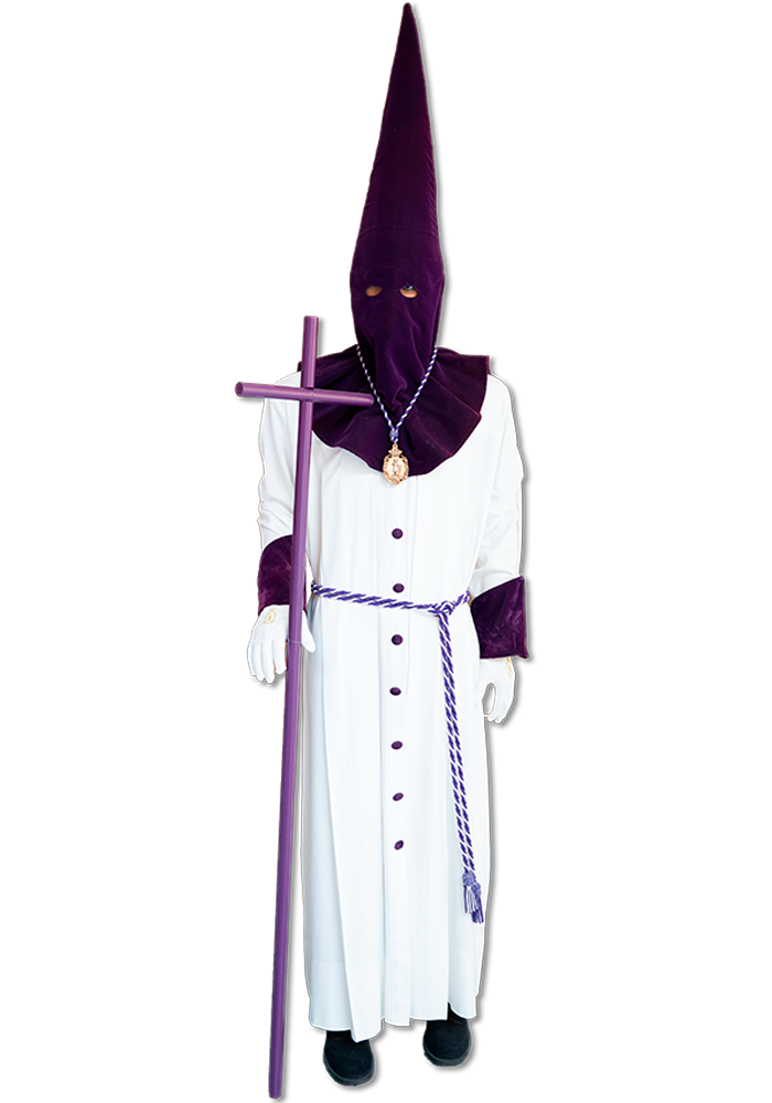 La indumentaria se compone de túnica de lana o tejido similar de color blanco-hueso; ceñidor, capirote y capa, además de pantalón oscuro, camisa blanca, corbata negra, zapatos y calcetines negros, lisos y sin adornos, guantes blancos y medalla con cordón. El ceñidor y el cordón de la medalla serán de blanco-hueso y morado entrelazados.
