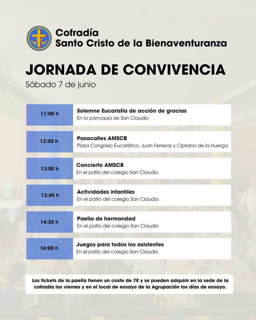 • 14:30 – Paella de hermandad. Los tickets, al precio de 7 euros, pueden adquirirse en la sede de la cofradía los viernes de 19:30 a 21:00 horas o en la nave de la agrupación en su horario de ensayos.