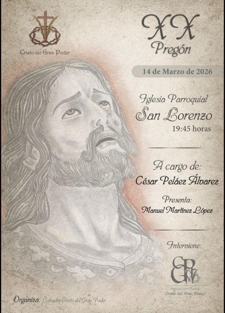 El próximo sábado 14 de marzo, a las 19:45 horas, tendrá lugar el XX Pregón de la Cofradía Cristo del